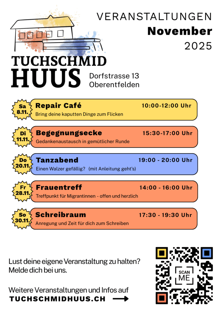Willkommen bei uns im Tuchschmidhuus! Der innovative und gemeinnützige Ort ist Schauplatz unterschiedlicher Angebote, die sich an die gesamte Oberentfelder Bevölkerung richten. Schau auch du vorbei an der Dorfstrasse 13.
