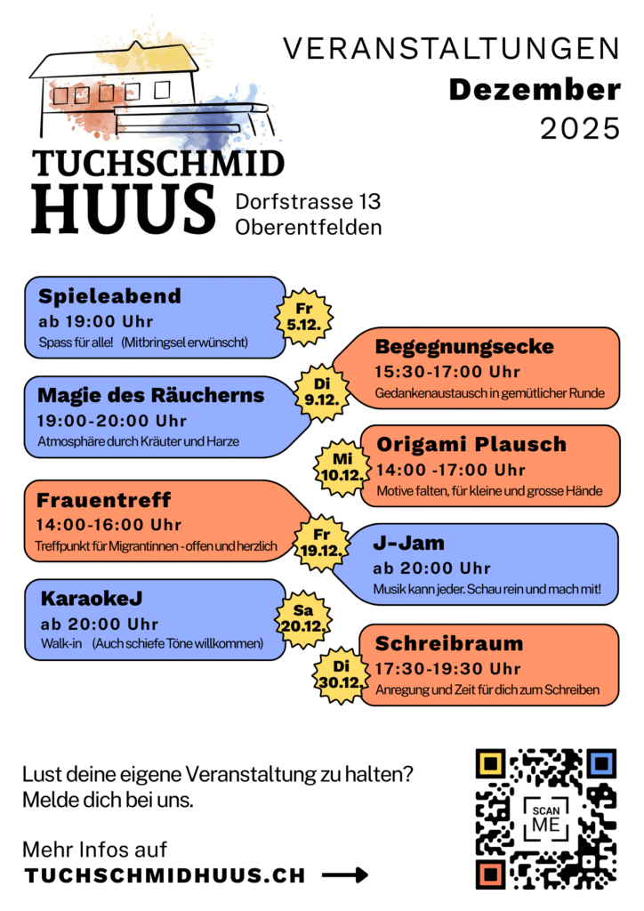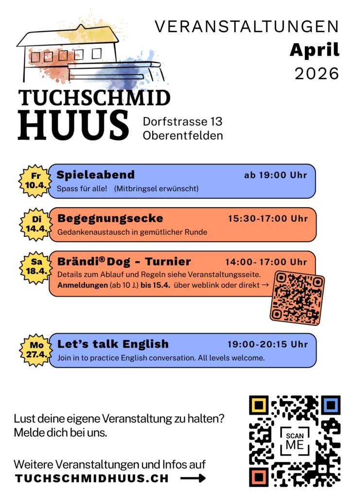 Willkommen bei uns im Tuchschmidhuus! Der innovative und gemeinnützige Ort ist Schauplatz unterschiedlicher Angebote, die sich an die gesamte Oberentfelder Bevölkerung richten. Schau auch du vorbei an der Dorfstrasse 13.